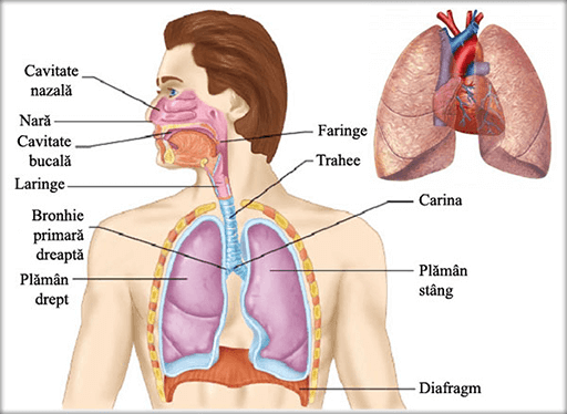 - Plămânii - localizați în cavitatea toracică, înveliți de pleure. La nivelul lor se găsesc alveolele pulmonare, în care aerul se acumulează și se realizează schimbul de gaze respiratorii.
